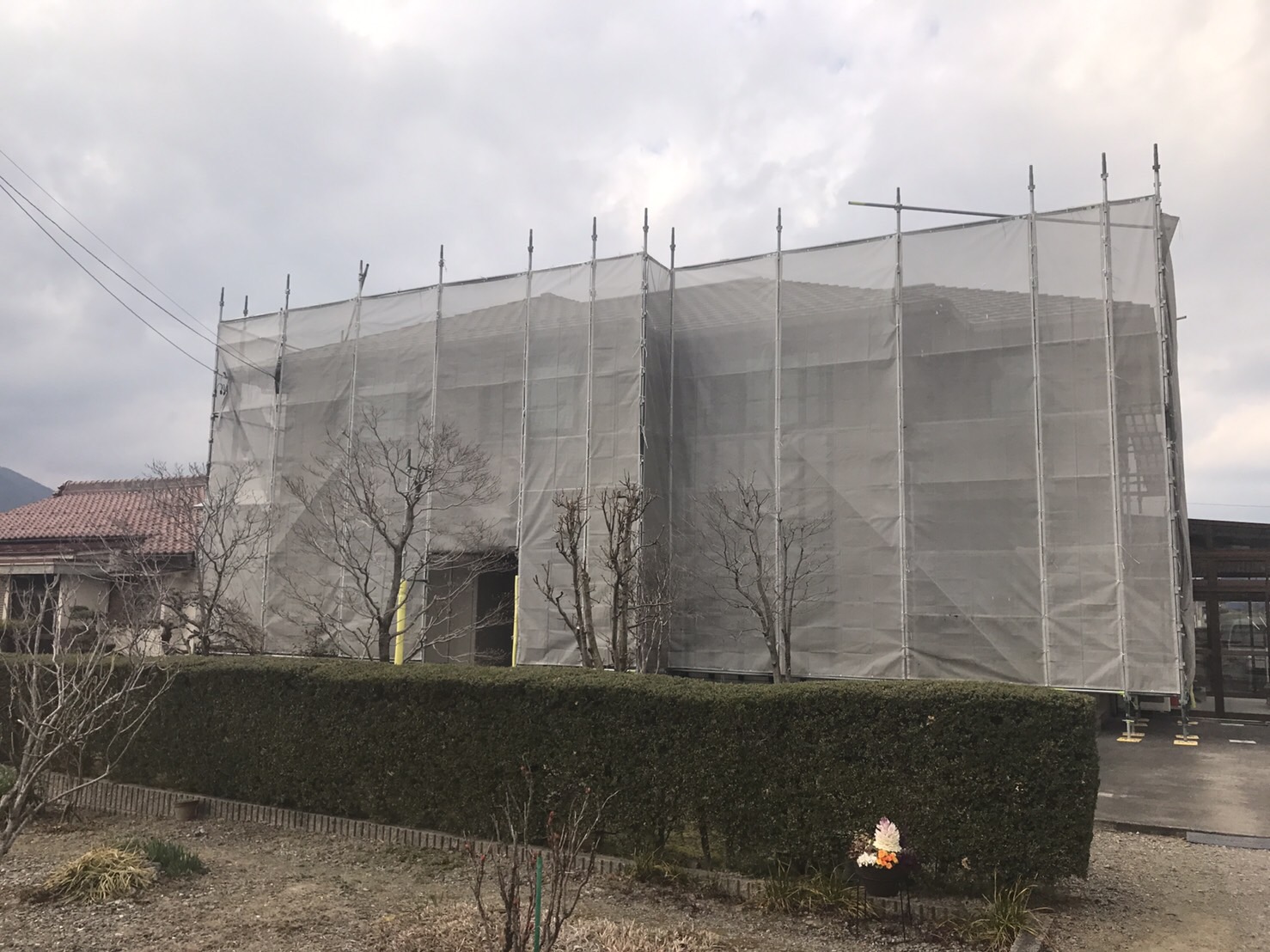 揖斐郡池田町 足場の架設後外壁塗装工事スタート