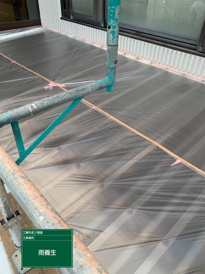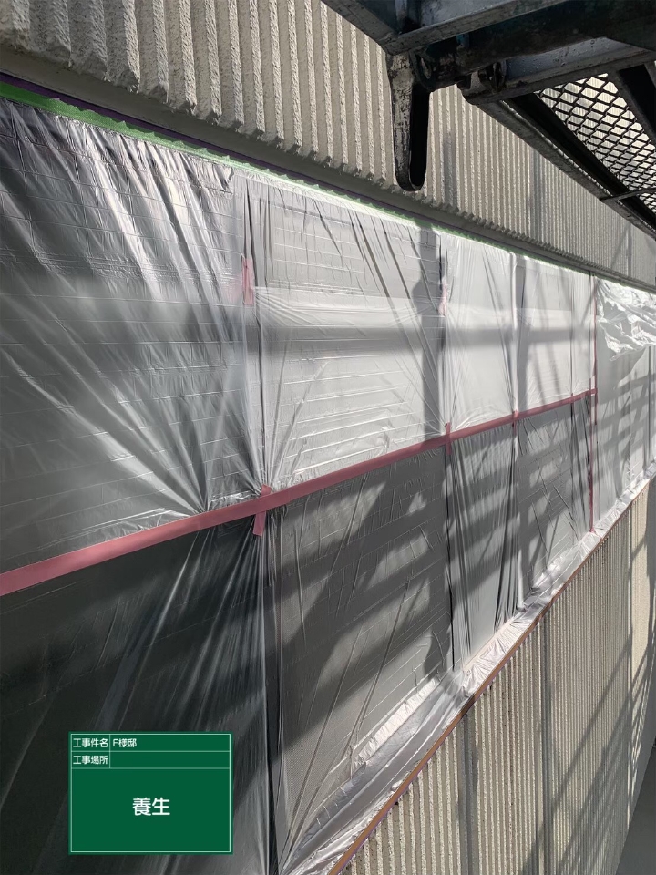 塗料は液体なので塗装する際に周りに飛散します。足場を組む際に建物全体を覆うように飛散防止ネットを掛けていますが、窓枠や樋などの付帯部やそのほか塗料の付着や飛散が予測できる箇所はビニールなどを使って全て覆い、塗料が付着することを未然に防ぎます。養生をする際に使用したテープやビニールは全体の施工完了後に取り外すので残るなどといったことはありませんが、テープの貼り方などによっては境界が滲んでしまったりガタガタになる可能性もあるので慎重に行います。塗装後のチェックで境界がぼやけていた場合は養生を撤去した後にライン出しを行い見栄えを整えます。