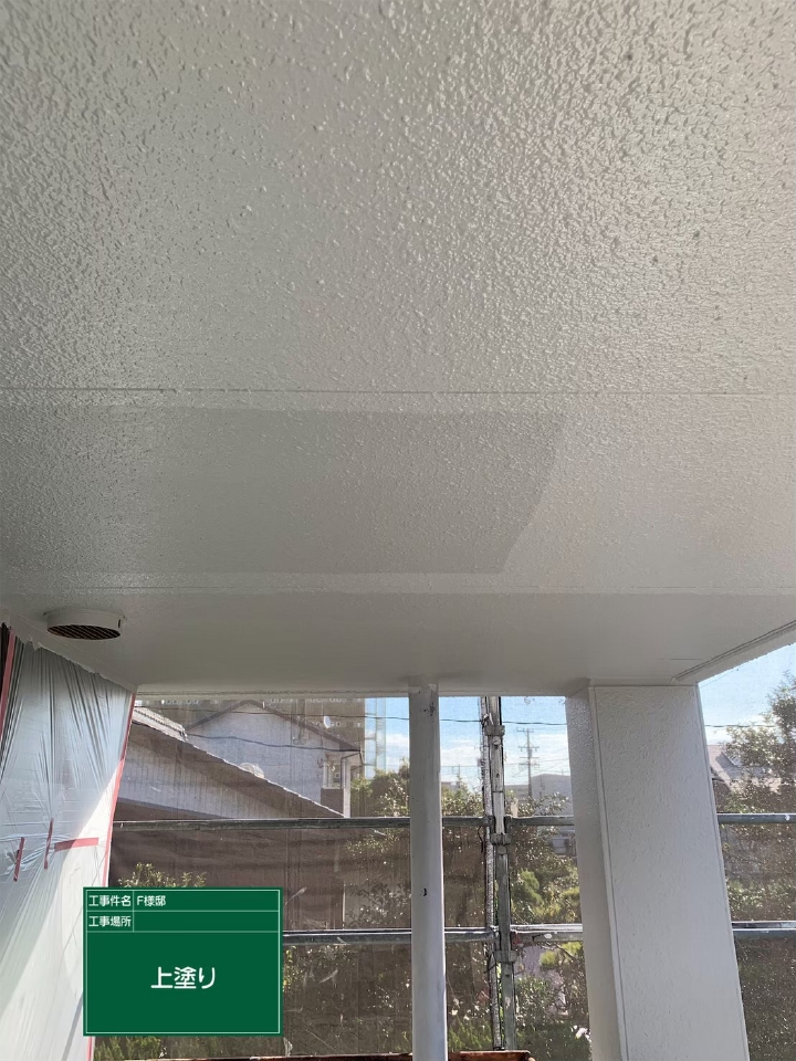 軒天の仕上げ塗装工事です。上裏(あげうら)とも表現します。玄関で雨水に濡れることなく鍵を開たり、窓からの雨水の吹き込みがないなど、このような生活が出来ているのは屋根の軒(のき)と呼ばれる部分が外壁より外側に出ているからです。付帯部などの金属部分は塗装をする前に錆を落としたり、塗料の密着度を高めるために傷をつける役割のある「ケレン作業」を実施します。外壁塗装とは異なり湿気の帯びやすいこの部分にはカビの生えにくい専用塗料で塗装します。塗料の粒子が細かく基材に浸透しやすいため高い吸着力があり目地や釘頭などを目立ちにくくする効果もあります。